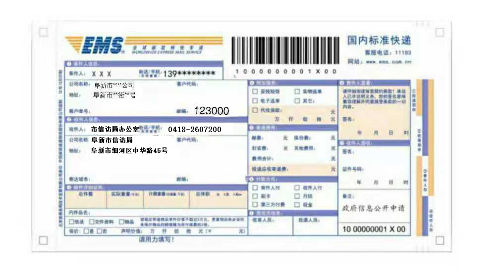 2.向阜新市信访局申请政府信息“特快专递”式样